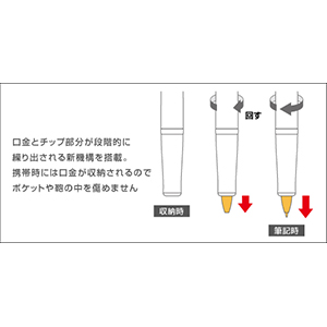 | ダブルアクション繰り出し式 | 口金とチップ部分が段階的に繰り出される機構。携帯時には口金が収納されるのでポケットや鞄の中を汚したり、傷つけたりしません。
