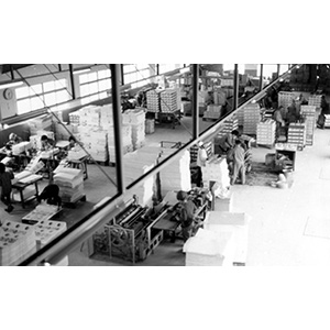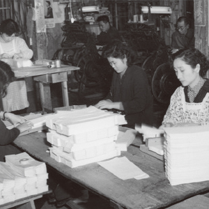 1947年(昭和22年)、昭和紙工株式会社として富山県高岡市内で創業。当時は、封筒、伝票の製造、販売が主でした。写真はショウワノート創業時の工場内風景。