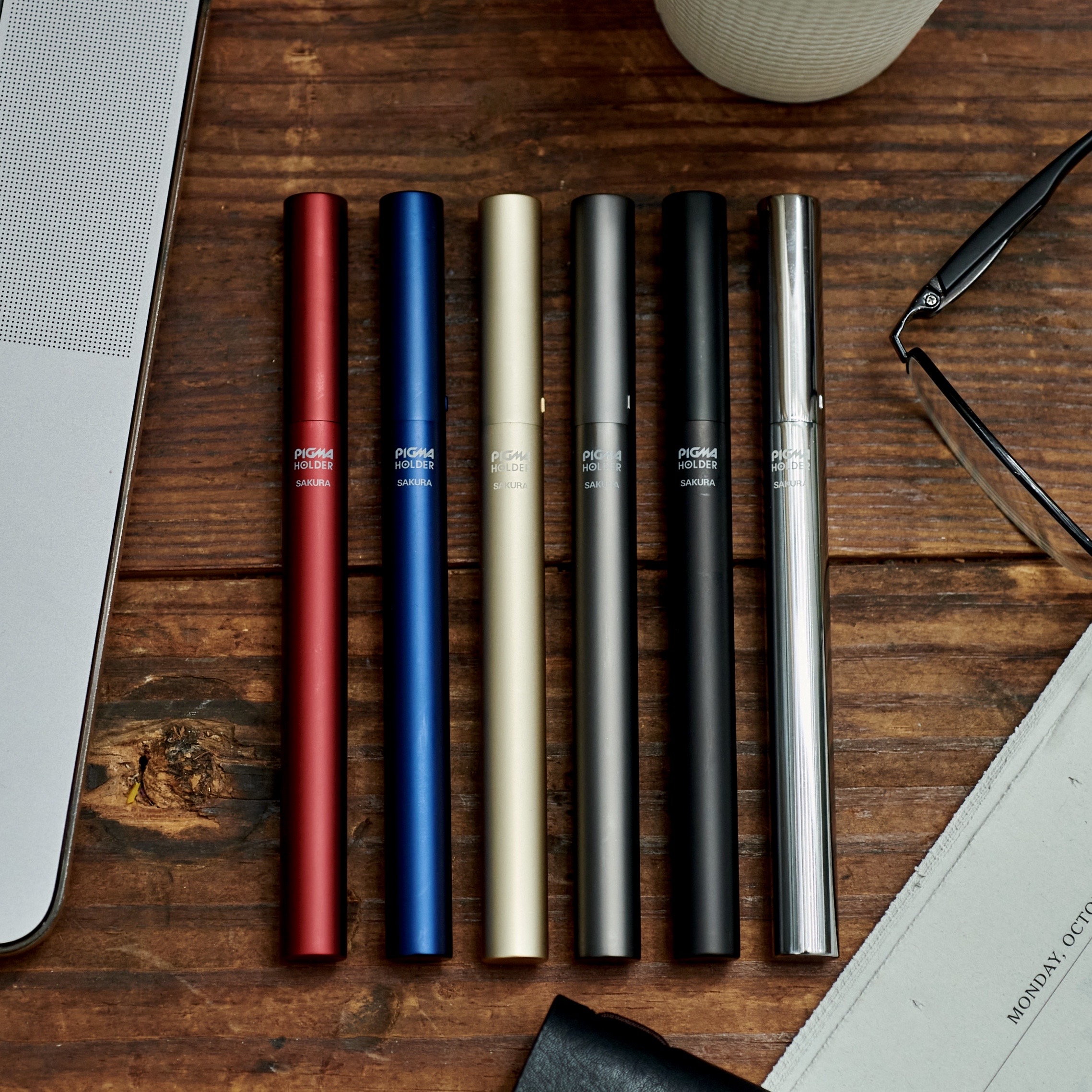 | ピグマホルダー | 「ピグマ」は、1982年にサクラクレパスが世界で初めて開発した水性顔料サインペンです。耐水性・耐光性に優れたペンで、イラスト・製図・手帳など用途に合わせてペン先・線幅・カラーをお選びいただけます。ピグマホルダーは、ビジネスシーンにも溶け込み、スタイリッシュに演出してくれるピグマ専用ホルダーです。