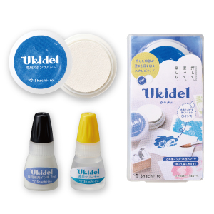 | 白色 | 「ウキデル」は水性染料インキを弾く特殊インキを採用した白色のスタンプパッド。お好きなゴム印でなつ印した印影の上から万年筆インクや水性ペンで塗ると、イラストが浮き出たように見えます。