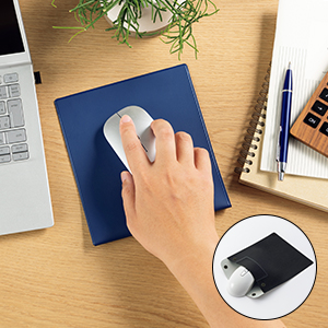 | ワイヤレスマウスのUSBレシーバー等を収納できる内ポケットが付いている | マウスやPC周りの小物を収納できるケースとマウスパッドが一体になったアイテム。内側には、ワイヤレスマウスのUSBレシーバー等を収納できる小さなポケットが付いています。フタとホック付きで、持ち運ぶときも安心です。