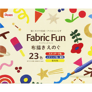 | アイロンをかけて定着 | 「ファブリックファン」は、ご家庭で簡単にご使用いただけ布用えのぐです。布に描くだけで、アイロンなしで定着し着彩後24時間以降で洗濯も可能です。表現の幅が広がる蛍光色やラメ、グリッター、蓄光など特殊色を豊富に揃えた全23色展開です。そのまま描くだけではなく、えのぐを混ぜたり組み合わせたりすることで、自由なアレンジが楽しめます。