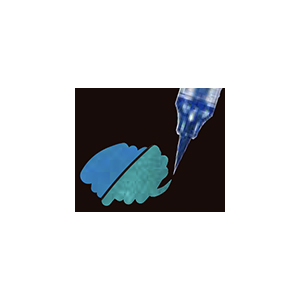 | 両端に穂先がある | 「デュアルメタリックブラッシュ」は、鮮やかな発色の染料とグリッター顔料を配合することによって、見る角度によって色が変わる・黒い紙と白い紙で書いたときに見え方が変わるインキを実現した筆ペンです。主役級のかがやきを表現できるため、色紙やスクラップブックのデコレーション、大人のぬりえにもおすすめです。