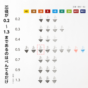 | 2.0 | 0.2の超極細芯は、オレンズの他、自動芯出し機構のオレンズネロやオレンズATで使用できます。また、1.3の太芯はマークシート用途やデッサン用途の他、小学生のはじめてシャープペンとしてぴったりなAMAINシャープペンで採用している芯径です。