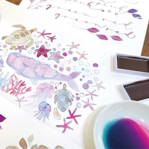 | 色が分離する | 色が分離されることで幻想的な表現ができる顔彩絵具です。紙の種類によって、色の分離・にじみ方が異なります。たっぷりの水で溶き、パレットの中で色が分離してから描くと、より色の変化を楽しむことができます。