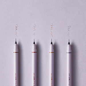 | 水性染料インキ | 「くれ竹美文字 完美王【Cambio】」は、カートリッジを押さずにインクが自然に流れる新機構を採用しています。筆ぺんを使用の際のインクのかすれ、出しすぎ、書き味などを改良。芯先は3種類、中字のみうす墨と朱墨も発売しています。