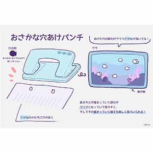 | おさかな穴あけパンチ | サンスター文具が開催する「文房具アイデアコンテスト」は2025年で30周年を迎える歴史あるコンテストである。このコンテストで入賞した作品の中には、サンスター文具から実際に販売されている商品がいくつも存在する。「おさかな穴あけパンチ」は、2023年の文房具アイデアコンテストで入賞した作品。その他の選択肢は、それぞれ文房具アイデアコンテストに入賞した後、2025年7月までに店頭で販売された商品である。