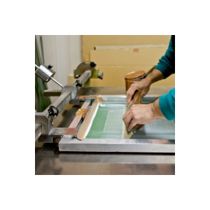 | シルク印刷 | スクリーンメッシュを、ステンレス枠にきつく張ったものを使い、そのスクリーン枠に感光剤を塗布して、文字や絵を焼き付けることで版が出来上がります。印刷は版にインクを落とし、手刷りか半自動式の印刷機を使って行います。
